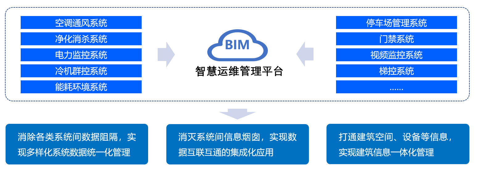 实现智慧建筑BIM运维平台的“集约建设、资源共享、规范管理”,结合建筑的实际情况,将各个子系统、数据信息与服务资源进行综合的集成,从而提高建筑的运维管理水平和综合服务能力。