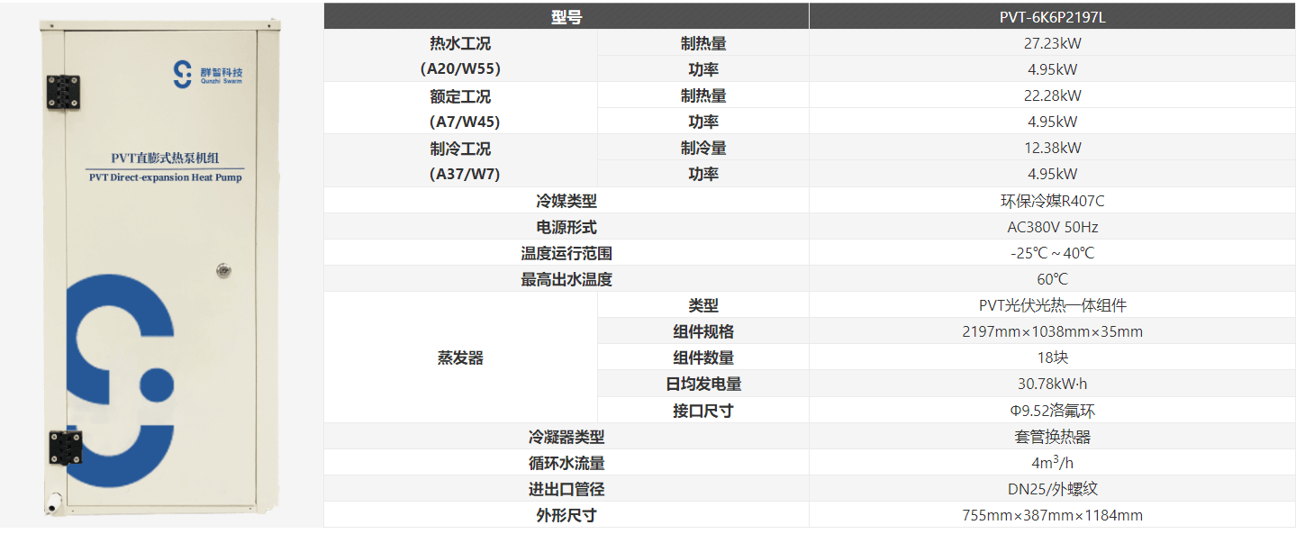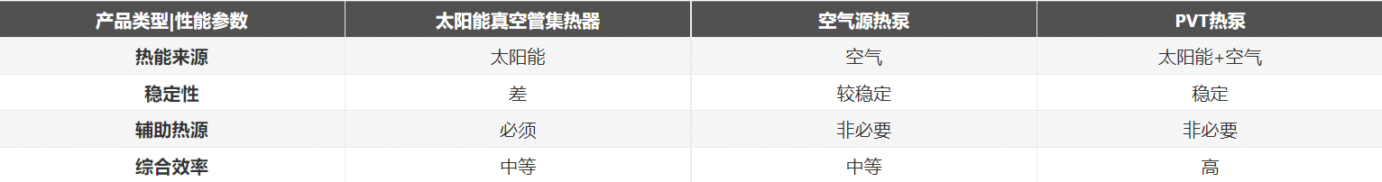 | 产品类型|性能参数 | 太阳能真空管集热器 | 空气源热泵 | PVT热泵 |